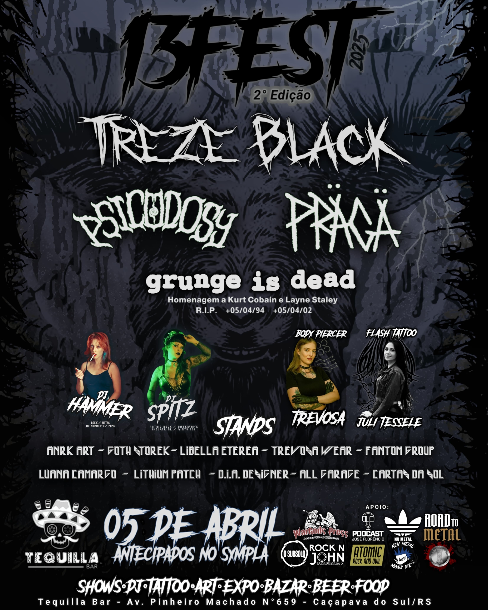 O 13Fest contará com quatro bandas, incluindo os anfitriões do Treze Black e os grupos PSICODOSY e PRÄGÄ. Uma das novidades desta edição é o projeto especial “Grunge is Dead”, uma homenagem a Kurt Cobain (Nirvana) e Layne Staley (Alice in Chains), que faleceram em 5 de abril de anos distintos. Além das apresentações ao vivo, o festival terá performances de DJs, com DJ Hammer e DJ Spitz comandando as pick-ups ao som de muita música alternativa.