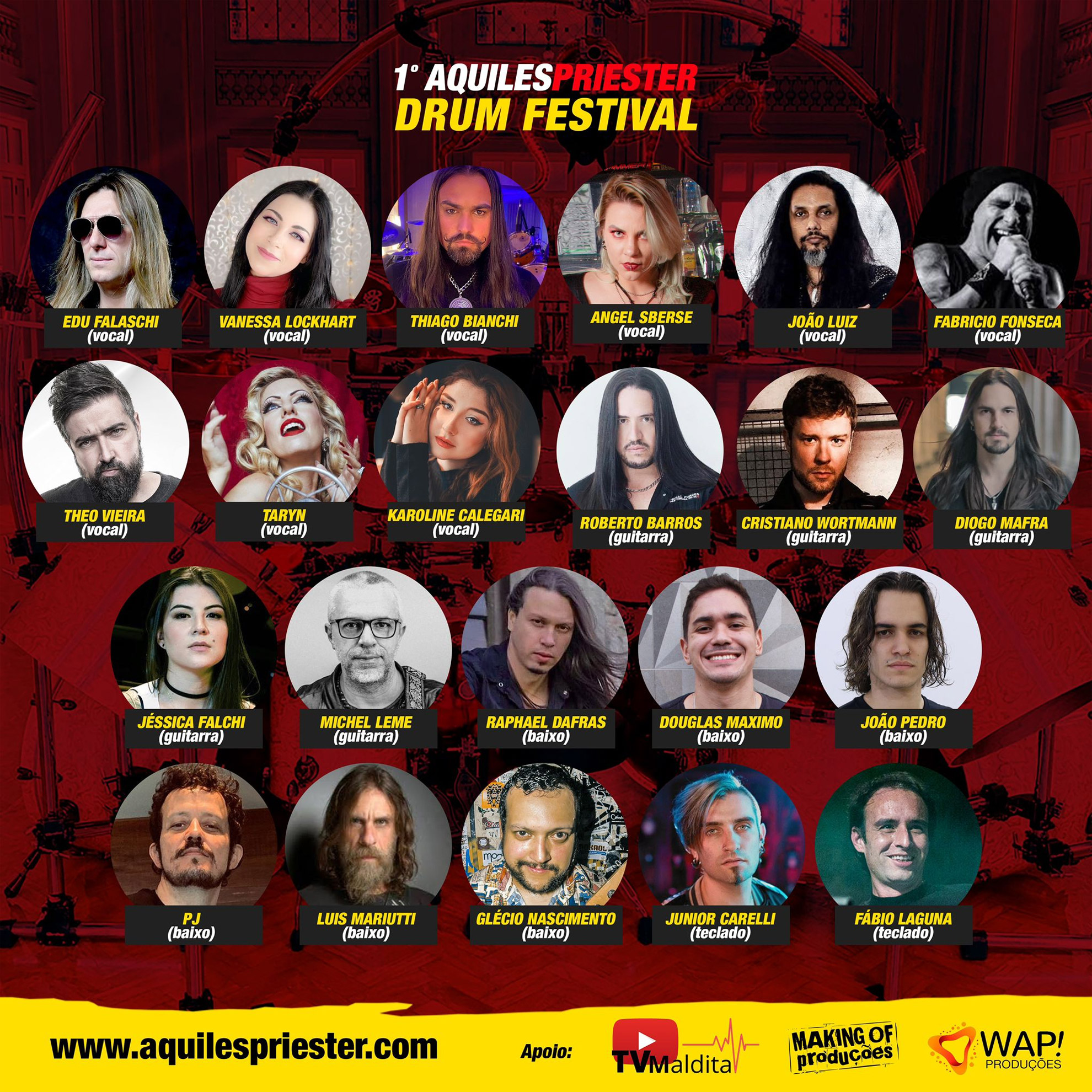 Assim nasceu o 1º Aquiles Priester Drum Festival, primeiro, pois já sabemos que o homem não vai parar. “Fiquei muito feliz quando todos esses bateristas aceitaram participar do festival, pois esse é um evento diferenciado e que celebra a união da bateria do Brasil. Principalmente porque todos eles vão tocar uma música na minha bateria. Bateria é um instrumento muito pessoal e só o fato deles terem aceitado mostra o tamanho da união da classe dos bateristas do Brasil. Tenho certeza que esse festival será um divisor de águas e eu acredito que será apenas o primeiro”, disse Aquiles.