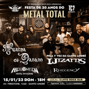 O festival Metal Total, que completou 20 anos em 2022, reunirá neste domingo, 15/01, no Santo Rock Bar em Santo André, dois grandes nomes do metal nacional: Tuatha de Dannan (que estará lançando seu novo single “The Nameless”) além do Wizards, que se apresentará pela primeira vez na cidade, e estará lançando seu álbum “Seven”. O show ainda contará com a banda Rhegency, representante da região, além da banda Metal Invaders (Helloween cover).