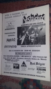 Felizmente dessa vez a banda alemã escalada veio e uma boa promoção para o show já estava em andamento desde maio pela Hurricane, a mesma produtora que havia colocado o Nuclear Assault em nossos palcos pela primeira vez, o que dava uma sensação de que ia dar tudo certo. Foram confirmadas para a abertura as bandas Hammerhead e Korzus e a data, 12 de agosto, no já citado Projeto Leste I, no Bairro da Mooca.
