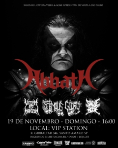 Olve Eikemo, mundialmente conhecido como Abbath e que já foi chamado de “Lemmy do black metal“, fez fama no Immortal, lenda do black metal da Noruega. Agora, o vocalista e guitarrista voltará a São Paulo com sua banda para um show no dia 19 de novembro (domingo) na VIP Station. Os ingressos antecipados online para o evento, que contará com as bandas Infamous Glory, Sangue de Bode e Vitam Et Mortem (COL), já estão à venda através da Bilheto.