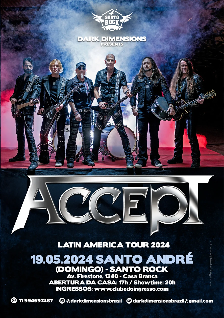 Uma das bandas mais importantes de Heavy Metal na história, os alemães do Accept se apresentarão em Santo André pela primeira vez – depois de terem feito um show sold out em São Paulo, no Carioca Clube. O show de Santo André será no dia 19 de maio (domingo), no Santo Rock Bar (Av. Firestone, 1340 – Casa Branca – Santo André, SP), às 20h (abertura da casa: 17:00 Início: 20:00). A abertura fica por conta da banda Skalyface.