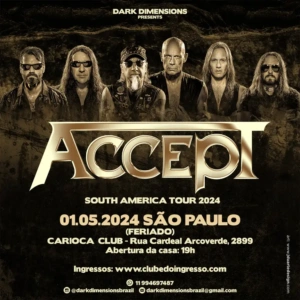 No dia 1 de maio de 2024 (feriado, a capital paulista será novamente palco de mais uma grande experiência para os amantes do Heavy Metal. A lendária banda alemã ACCEPT está programada para incendiar o Carioca Club Pinheiros com mais um show que promete ser tão memorável quanto os outros feitos em nossa terra.