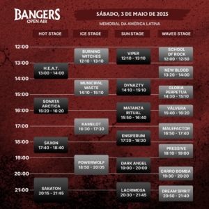 Bangers Open Air, o seu festival internacional no Brasil, que acontecerá nos dias 2 (Warm-Up), 3 e 4 de maio, no Memorial da América Latina (SP), acaba de anunciar a grade oficial de horários de apresentação das bandas para a edição deste ano do festival. Agora, com os horários revelados, é hora do público se programar para aproveitar ao máximo os 3 dias de evento com muita música e experiências inovadoras como “signing session” com os artistas e a feira medieval, entre tantas outras.