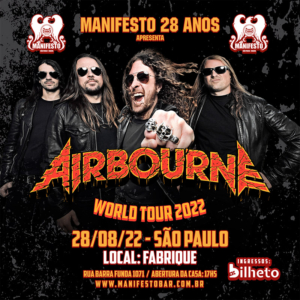 O Airbourne é formado pelos irmãos Joel O’Keeffe (vocal e guitarra) e Ryan O’Keeffe (bateria), Justin Street (baixo) e Matt “Harri” Harrisson (guitarra). Visitando pela segunda vez o Brasil – após um show explosivo em São Paulo em 2017 – já realizaram shows e turnês ao lado de grandes monstros da música pesada como o Iron Maiden, Mötley Crüe, Motörhead e os Rolling Stones.