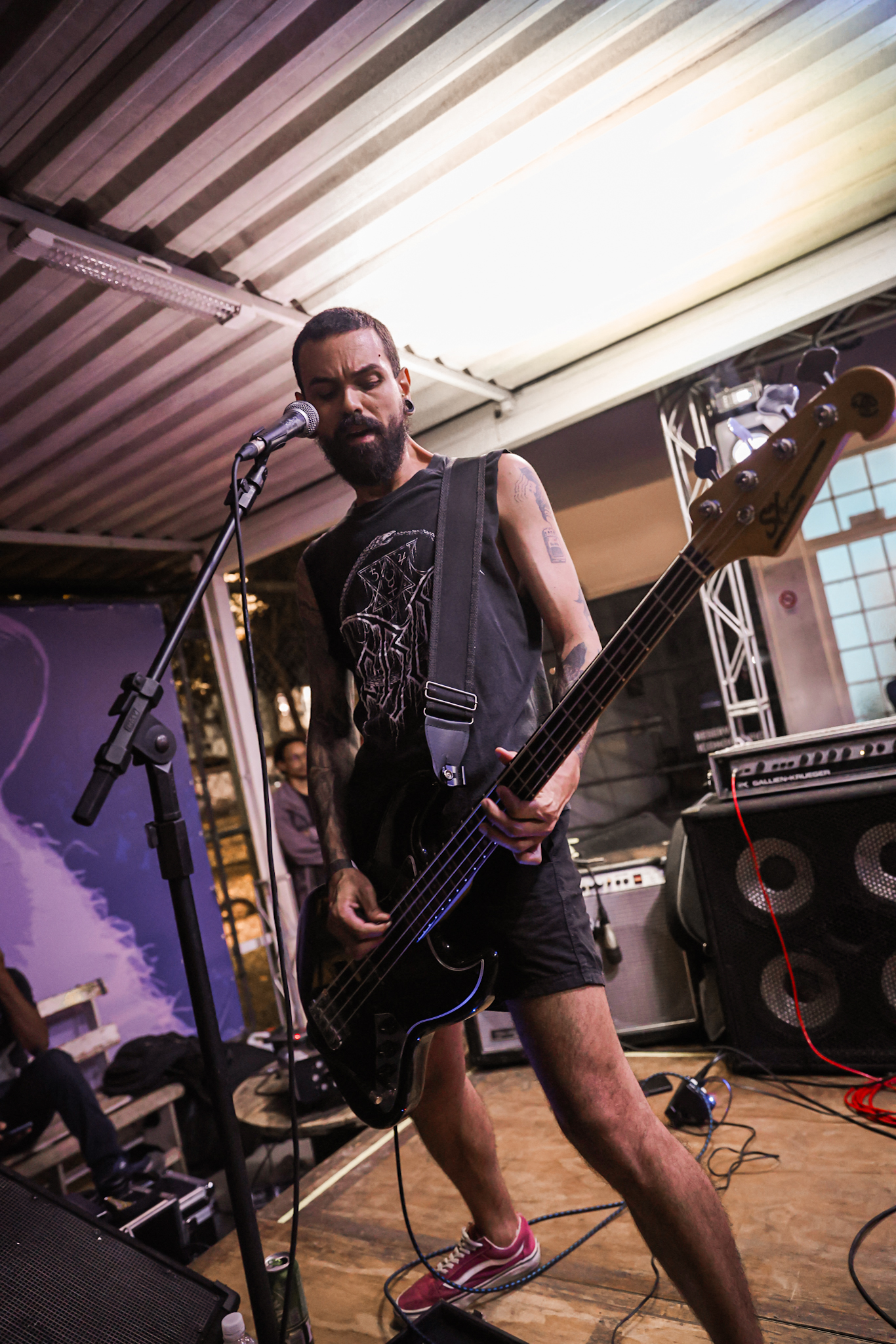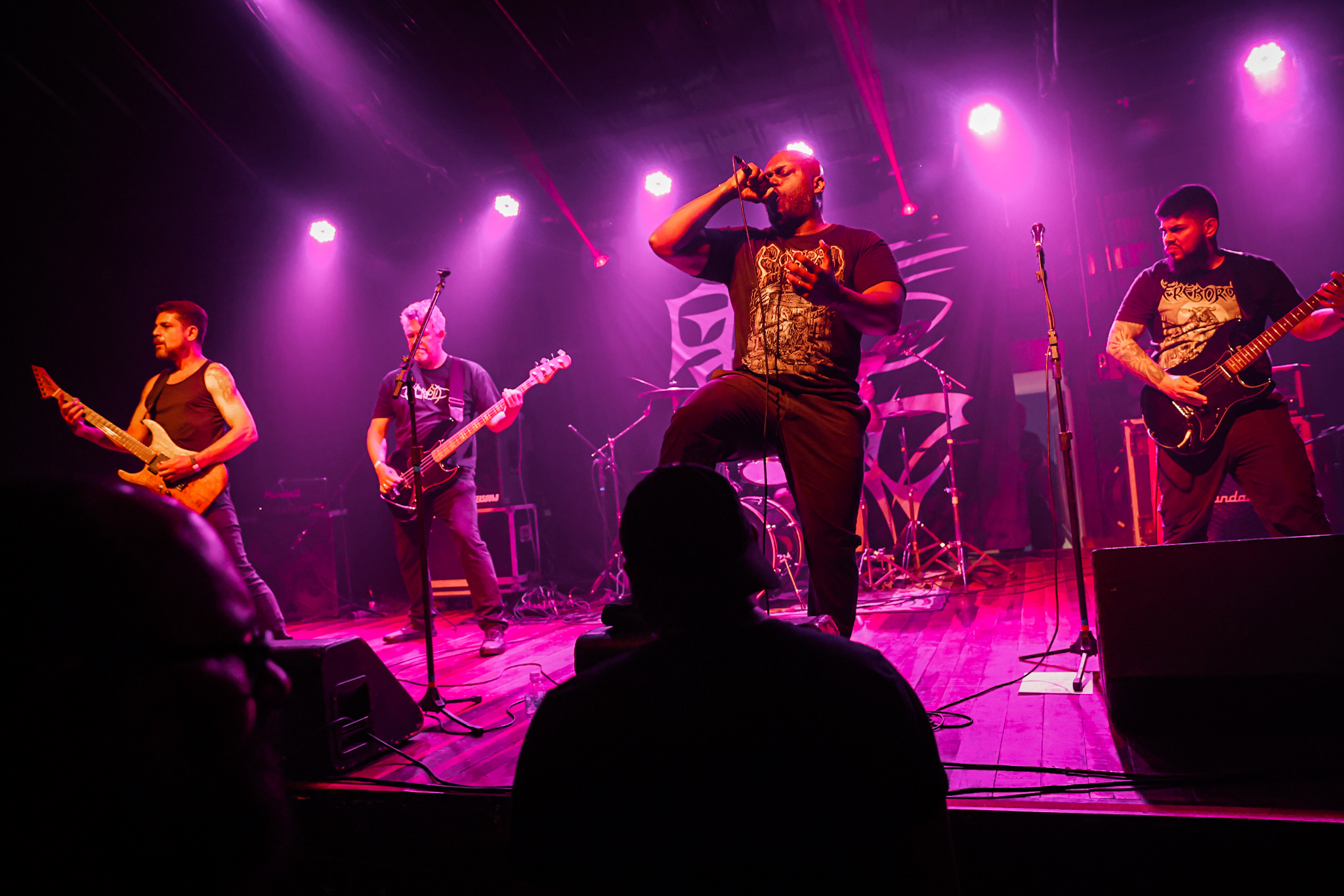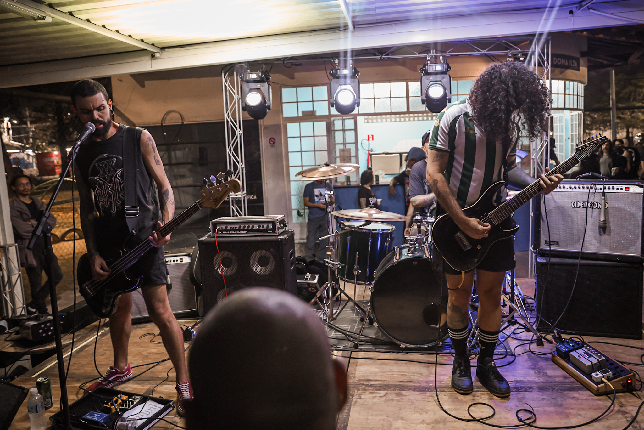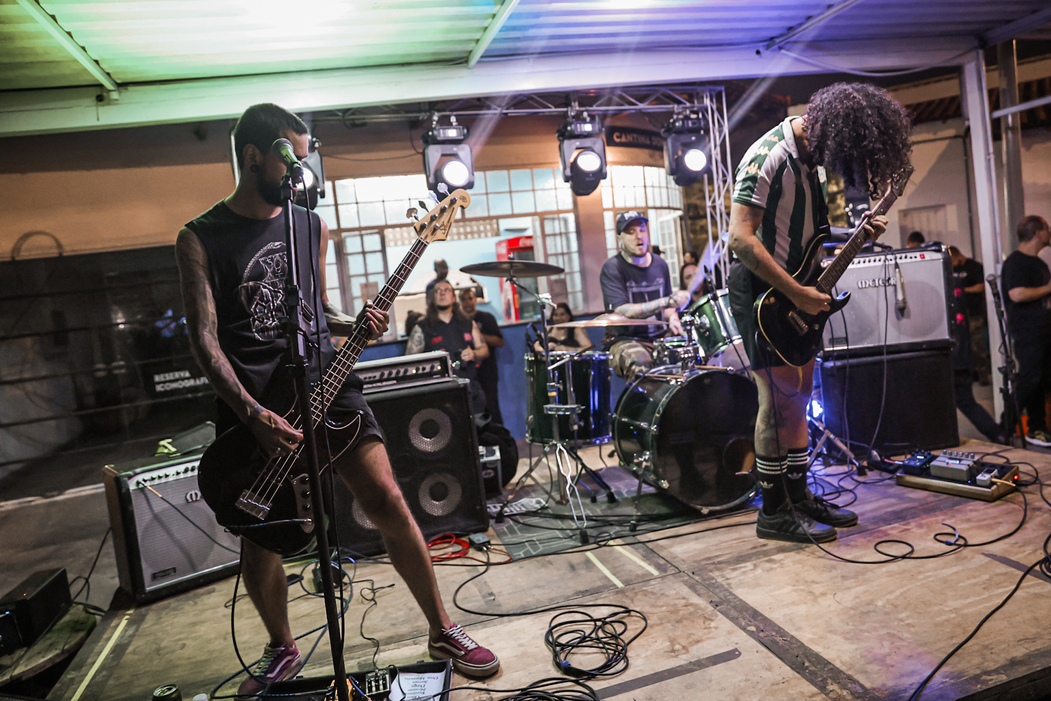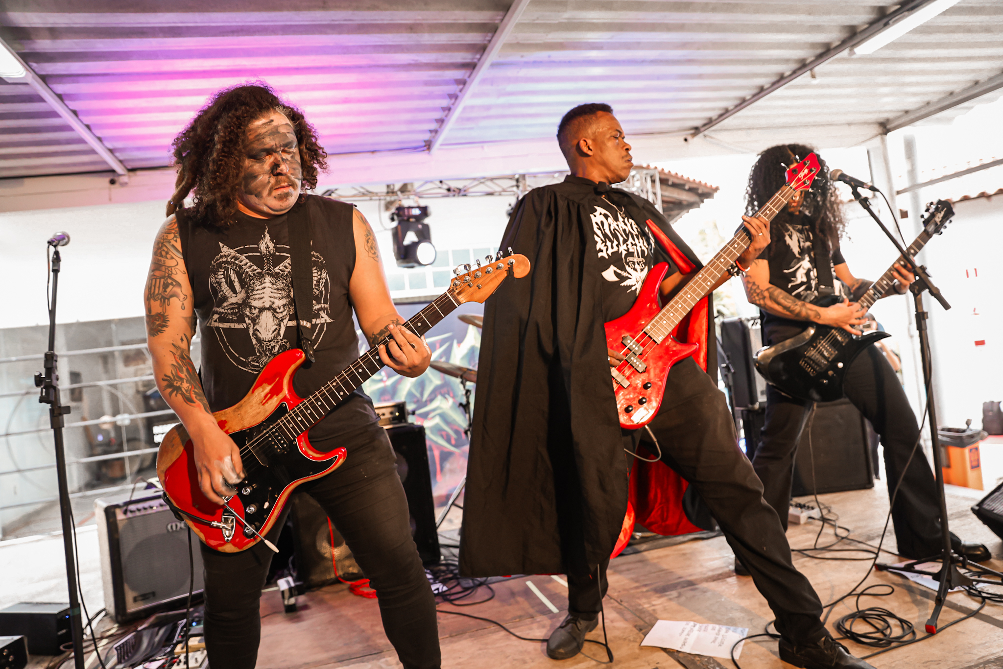 Sabendo desses horários, ao chegarmos na casa, por volta de 18:40, vimos o Austera, banda formada por Pedrito Hildebrando (vocal/baixo) e Luiz Mallet (guitarra), ambos ex-membros de uma das maiores e melhores bandas do Black Metal Carioca, Vociferatus. Ismael (bateria) completa a formação da banda e foi uma ótima chegada, pois o Hardcore deles, no qual flerta muito com o Black Metal mais atmosférico, tendo passagens belíssimas e altamente atmosféricas, somadas a um caos monstruoso com a violência do seu Hardcore. Que lindo cartão de visitas ao evento!