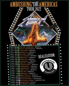Essa é a primeira vez, o primeiro ataque dos suecos do Ambush à América Latina e a longa turnê da banda, que tinha sido agendada a primeira vez para 2020, mas por conta da Pandemia da COVID-19, foi remarcada para esse ano, um dos destaques do N.W.O.T.H.M.(New Wave Of Traditional Heavy Metal), ao lado do Enforcer, irá começar pelo Rio de Janeiro, no dia 26 de Outubro de 2022, no point do Rock/Metal da Cidade Maravilhosa, o Heavy Beer Bar.