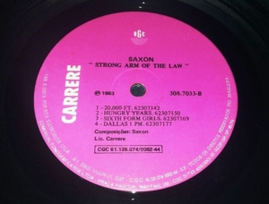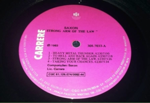 No Brasil “Strong Arm of The Law” foi lançado sem encarte interno no início da primeira metade da década de 80 pela RGE, que manteve o selo da gravadora Carrere (com sua cor bem chamativa) e seguiu a sequencia inglesa em relação a ordem das faixas. O Saxon ganhou muita popularidade no país graças aos lançamentos de seus discos nacionalmente e é claro, por sua qualidade como banda. Meu LP em particular foi comprado de segunda mão em um sebo, na cidade de São Bernardo do Campo-SP no dia 28 de fevereiro de 1986.