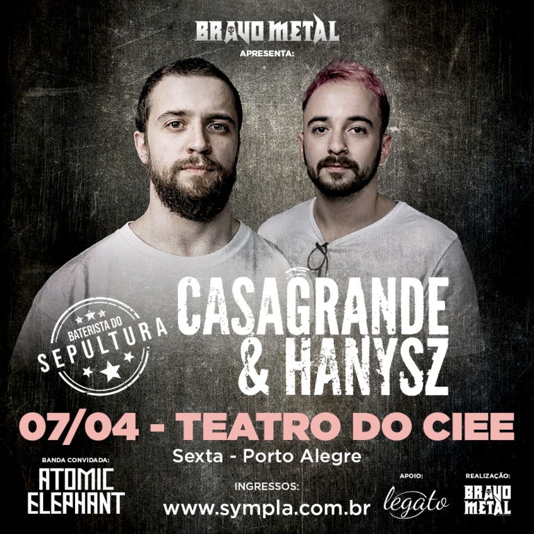 Marcado para o dia 07 de abril, o show de estreia do projeto CASAGRANDE & HANYSZ em Porto Alegre vem cercado de expectativa. Será a primeira vez que a capital gaúcha receberá esta nova empreitada do baterista do Sepultura, Eloy Casagrande, que em conjunto com o guitarrista João Hanysz extrapolam os limites da música com influências que vão desde MPB até o Heavy Metal, dentre outras sonoridades. E para abrir este show, coube à produtora BRAVO METAL MGMT a tarefa de convidar a banda local ATOMIC ELEPHANT, que assim como a atração principal, investe por mares musicais pouco navegados.