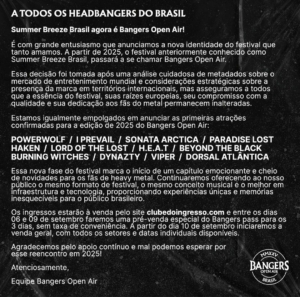 E hoje o Brasil Heavy Metal foi pego de surpresa com a mudança de nome do festival Summer Breeze Brasil para Bangers Open Air 2025 e com essa mudança de nome, tivemos o anúncio de 12 nomes para o vindouro festival.