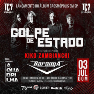 A apresentação marcada para o próximo dia 3 de julho (domingo) no Carioca Club (SP) será a primeira do Baranga desde o início da pandemia e o lockdown. O evento ainda contará com a presença do Golpe de Estado, que fará o show de lançamento do álbum “Caosmópolis”, e contará com participação de Kiko Zambianchi. “Este será nosso primeiro show com público presente, pois, desde o começo da pandemia, com o lockdown e todas as restrições, nós tínhamos somente tocado ao vivo no programa Kiss Club, da rádio Kiss FM, em setembro de 2020”, comentou o guitarrista Deca. “É enorme a sede de palco do Baranga e vamos fazer uma apresentação com intensidade máxima”, garantiu o baterista Paulão Thomaz.
