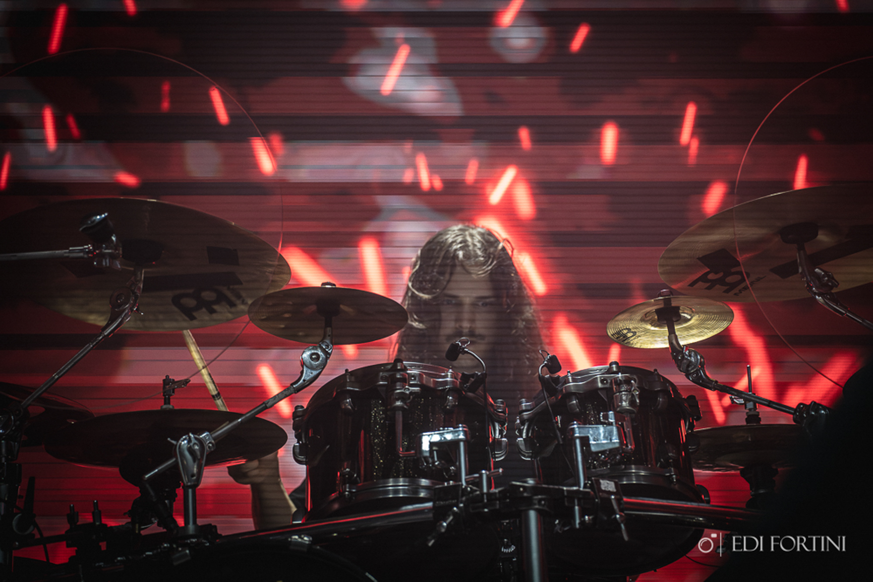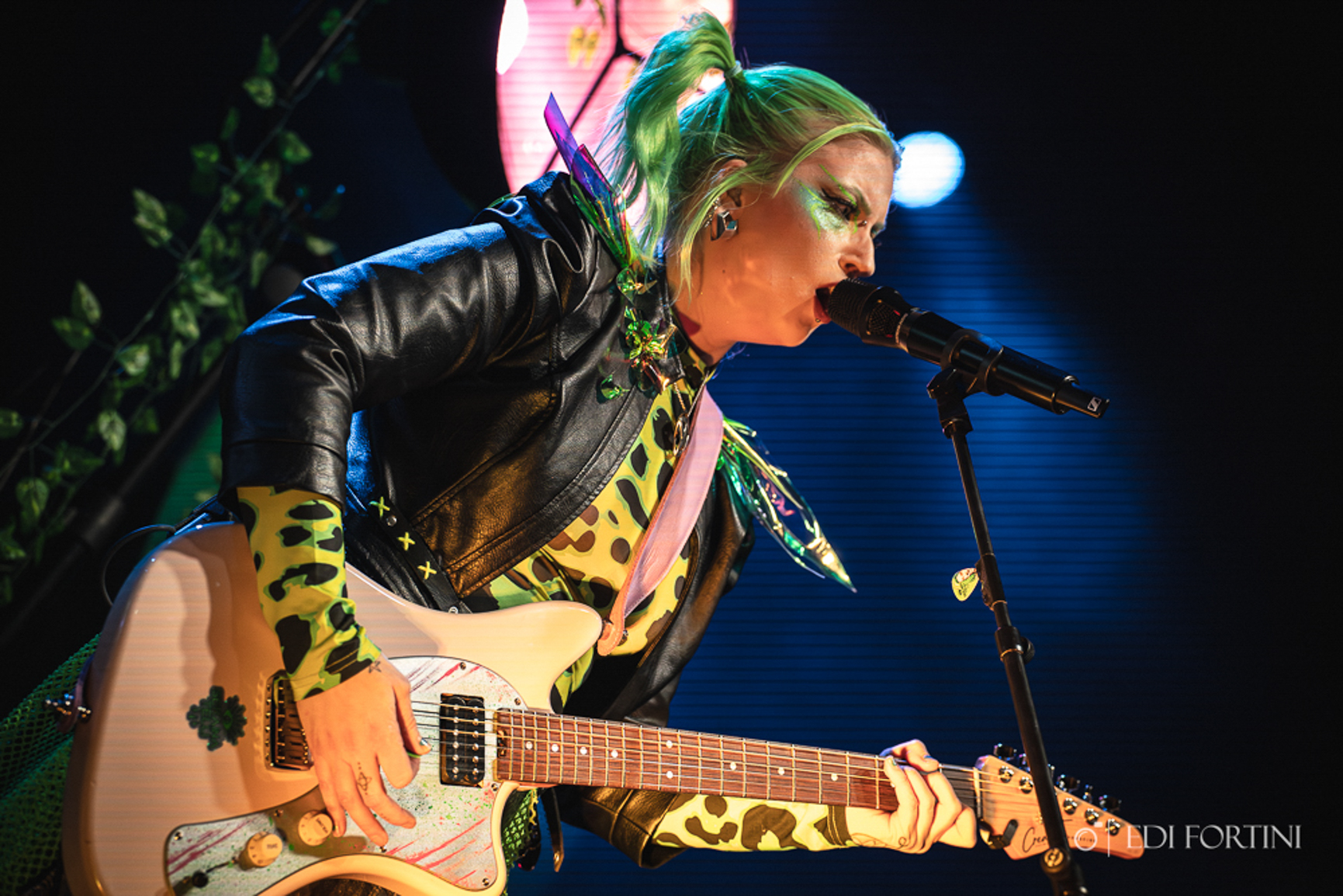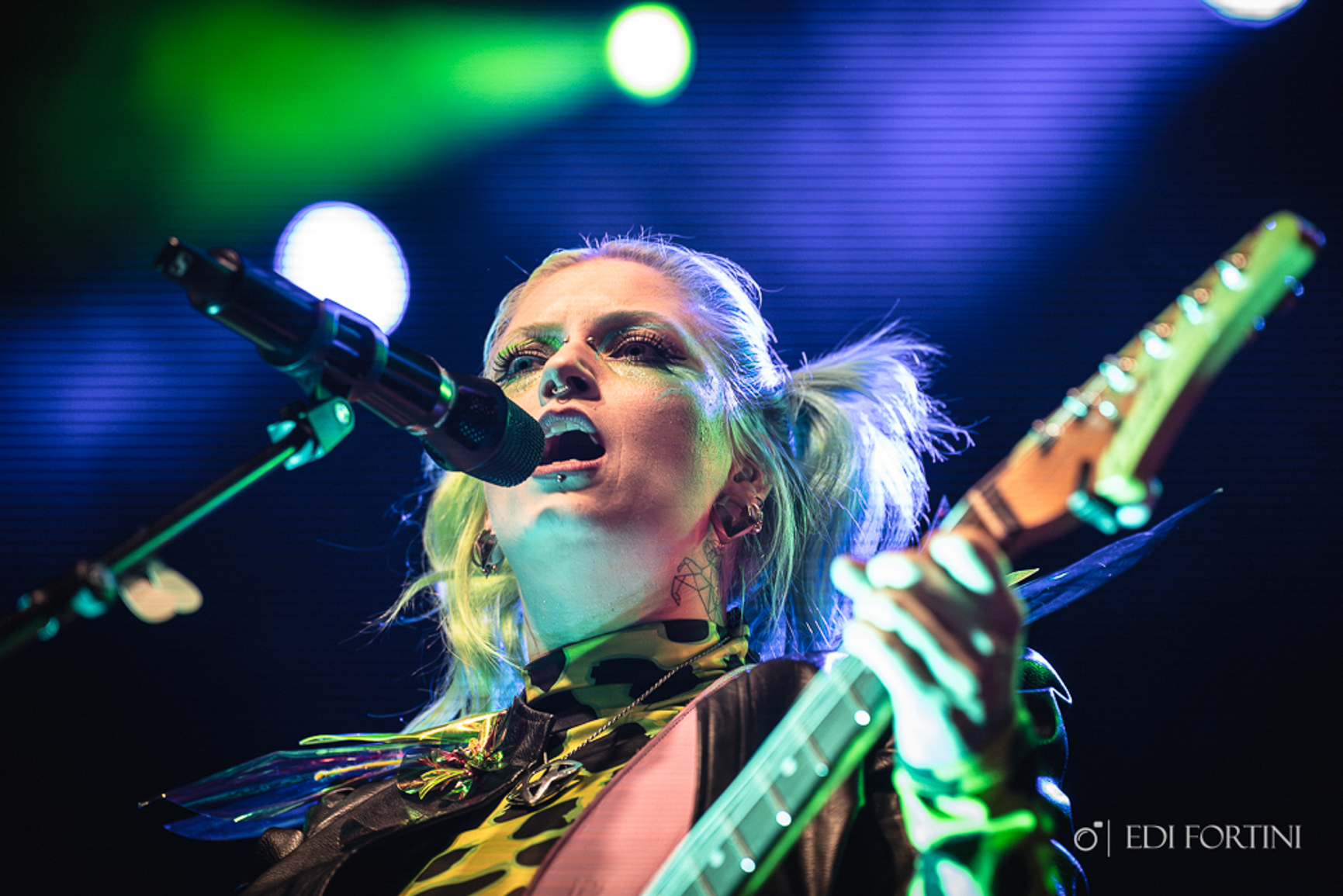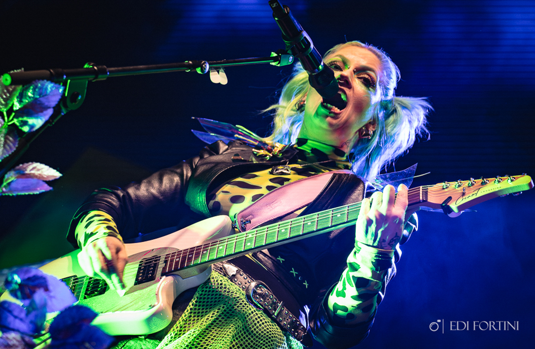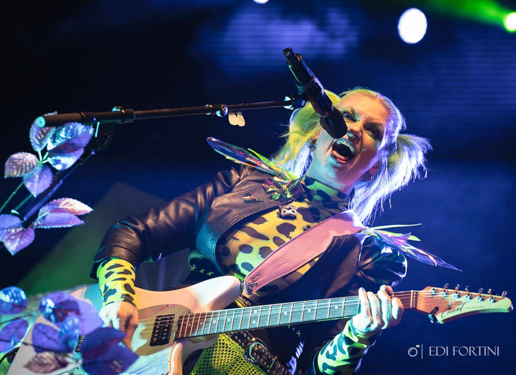 Abrindo a noite, Seraina Telli mostrou logo de cara que não estava ali para cumprir tabela. Ao lado do baterista Mike Malloth, ela tomou o palco com uma presença magnética, misturando hard rock moderno, atitude punk e uma estética visual que parecia saída de um conto de fadas contemporâneo. As flores gigantes iluminadas, o verde intenso das luzes e sua figura (cabelos azul-esverdeados, roupas coloridas, postura firme) criaram um universo próprio, quase onírico.