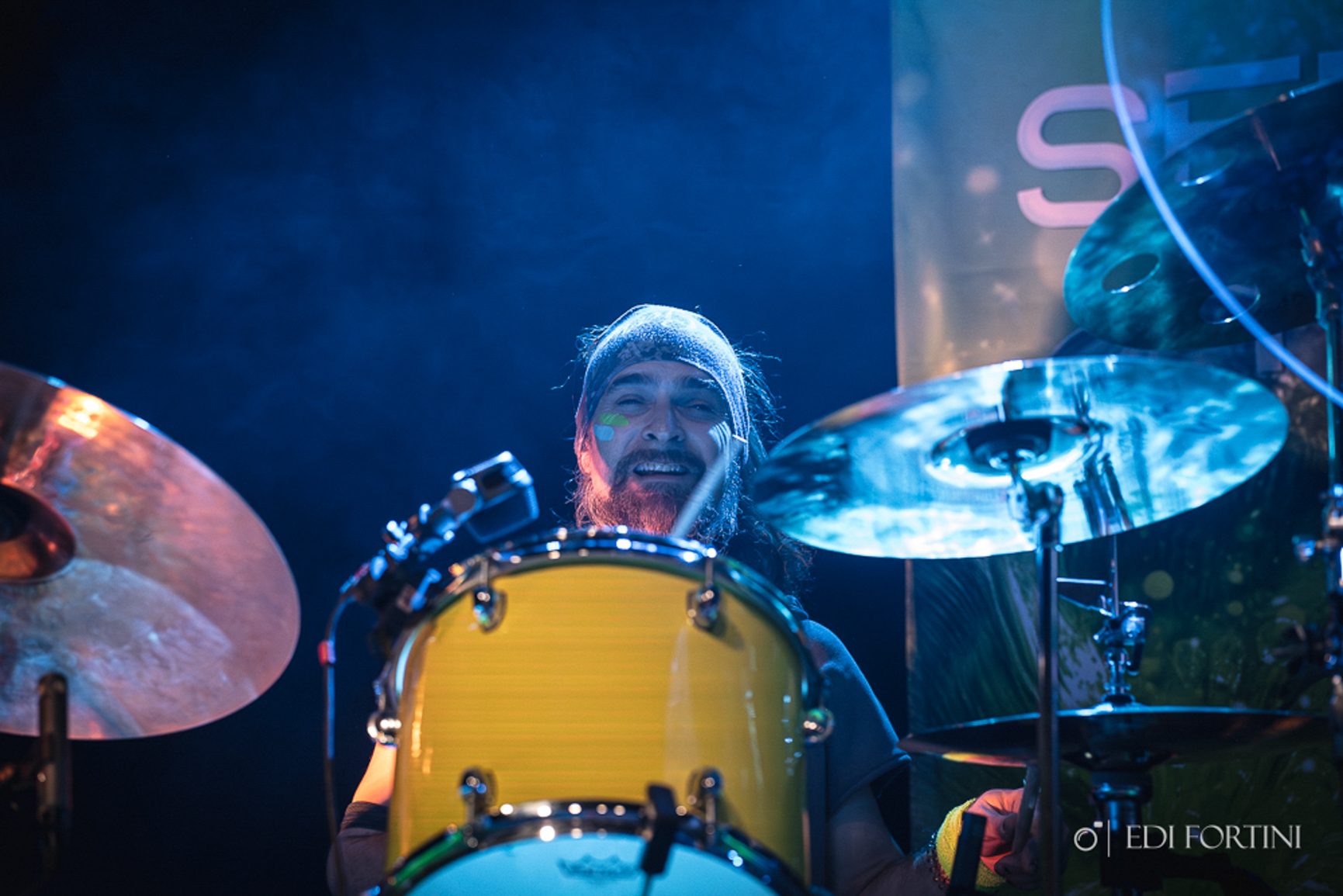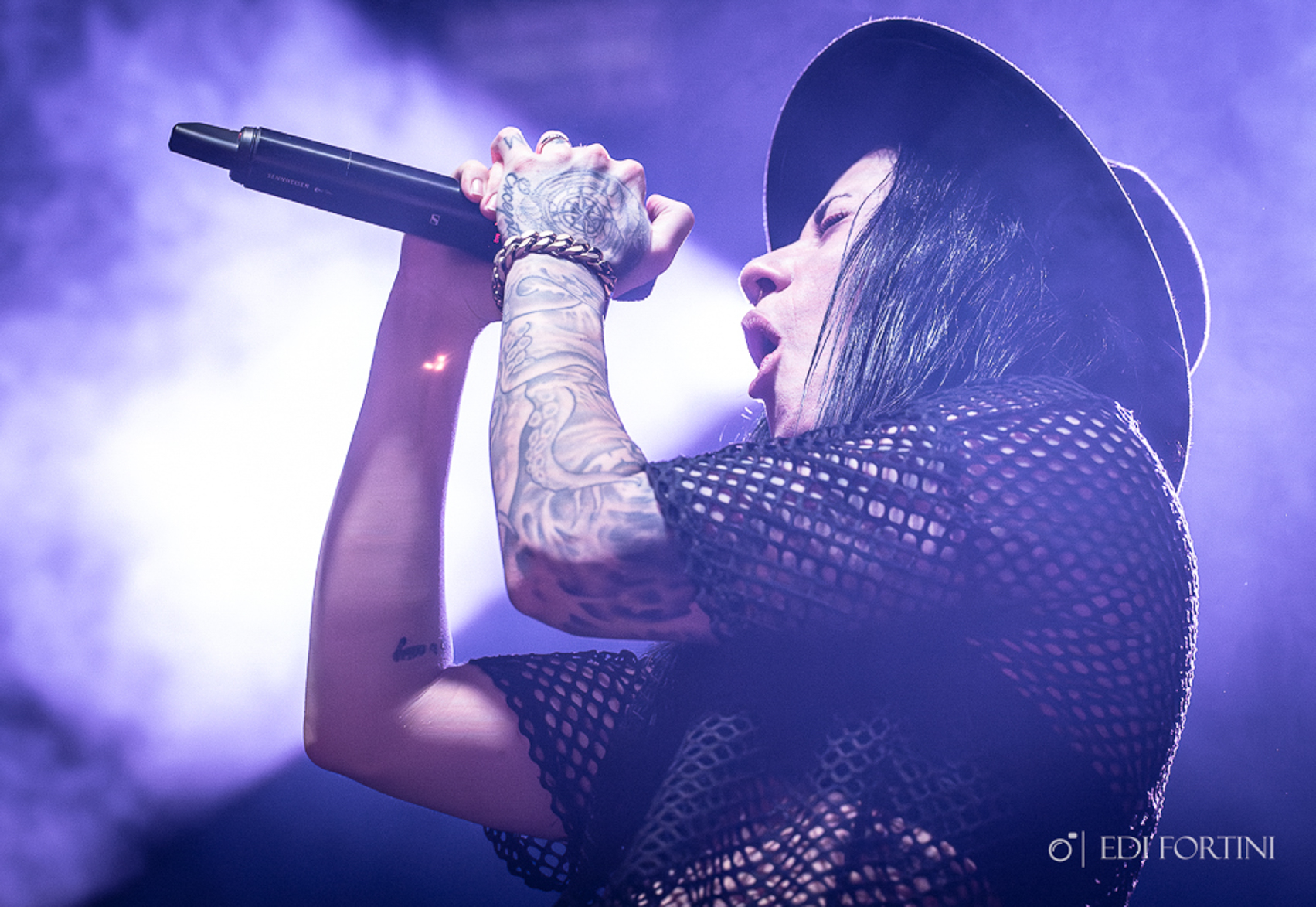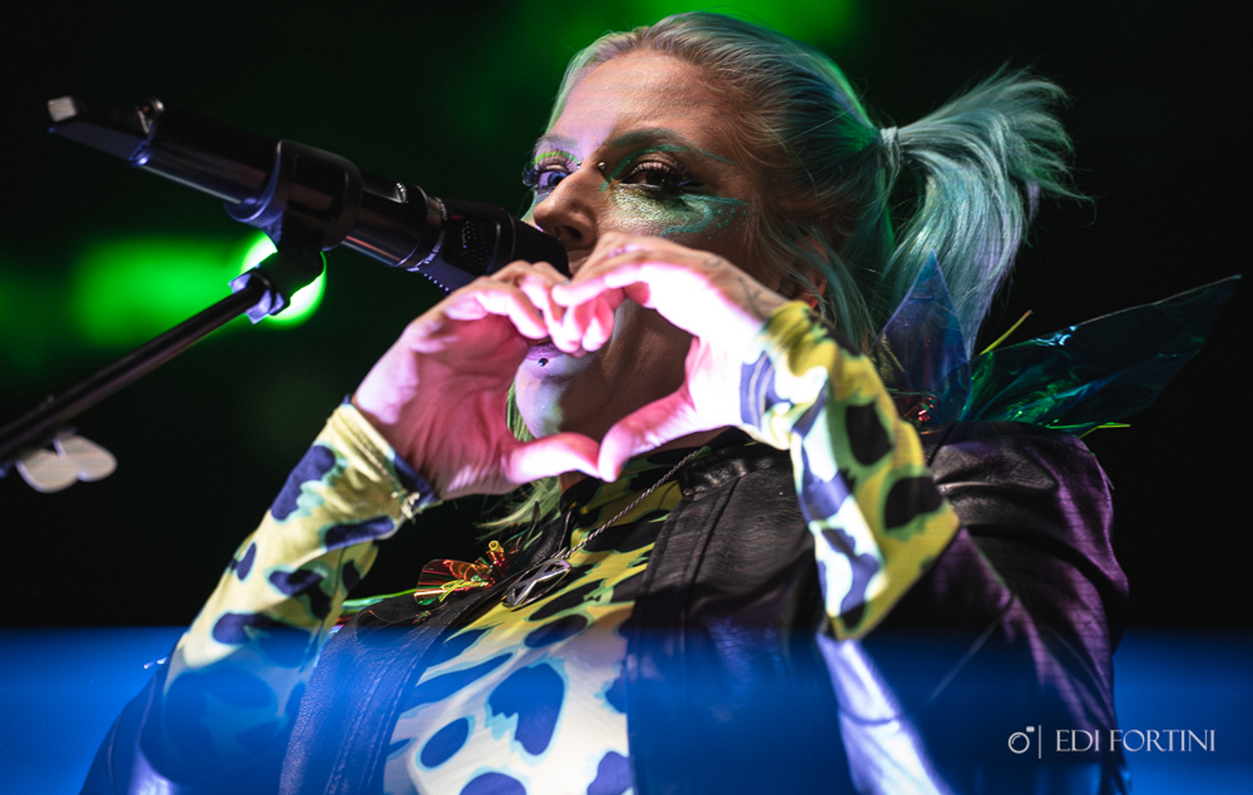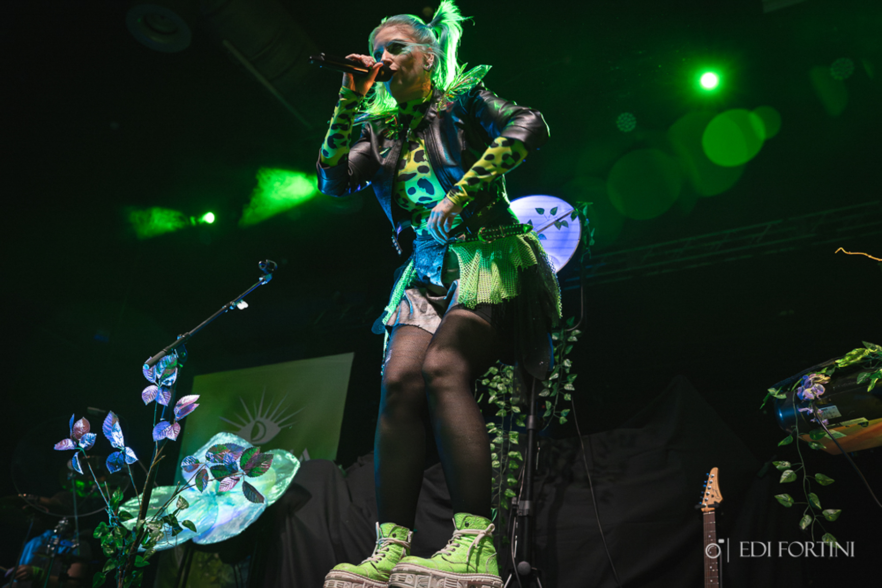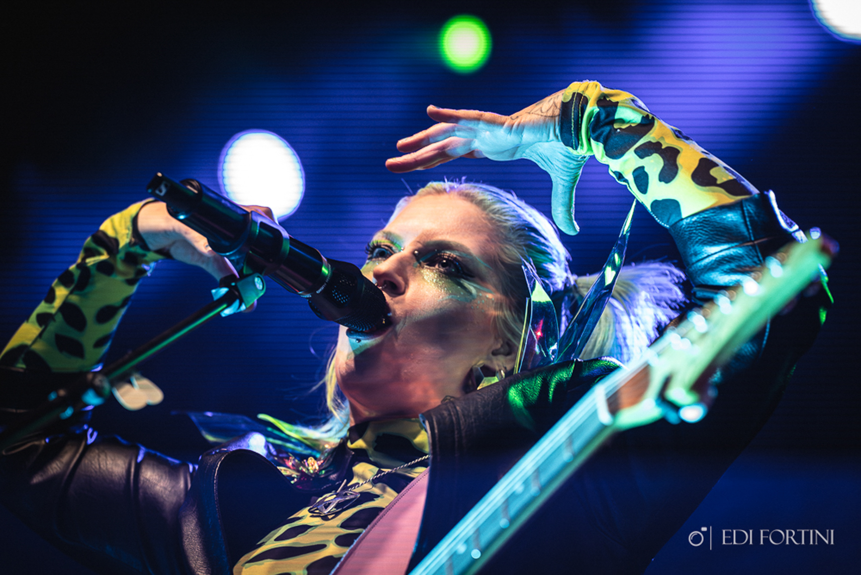 Abrindo a noite, Seraina Telli mostrou logo de cara que não estava ali para cumprir tabela. Ao lado do baterista Mike Malloth, ela tomou o palco com uma presença magnética, misturando hard rock moderno, atitude punk e uma estética visual que parecia saída de um conto de fadas contemporâneo. As flores gigantes iluminadas, o verde intenso das luzes e sua figura (cabelos azul-esverdeados, roupas coloridas, postura firme) criaram um universo próprio, quase onírico.