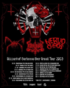 Depois de realizarem dezenas de shows por três continentes, chegou a vez do NervoChaos mostrar a força de seu último álbum, “Chthonic Wrath” (2023) para os brasileiros, na ‘Blizzard of Darknerss Over Brasil Tour 2023’, ao lado das entidades maléficas Mork (Noruega) e Funeratus (Brasil). Nesta quinta (19) começa essa nova empreitada, com show em Piracicaba/SP – o encerramento dessa perna da turnê com as duas bandas, acontecerá em 06 de novembro (segunda), em São Paulo (17 shows, depois!).