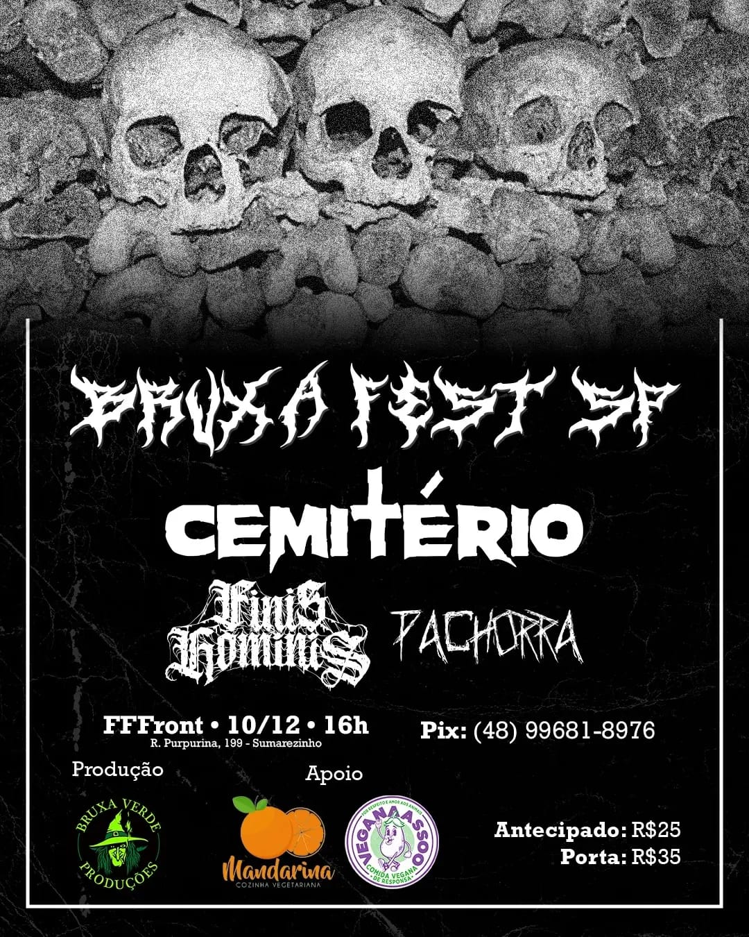 Para fechar o ano com tudo, a produtora leva para a casa de shows FFFront, na Vila Madalena, um evento que conta, além da banda Pachorra, com dois nomes fortes do cenário extremo local: as bandas Finis Hominis (Sludge/Death Metal) e Cemitério (Death Metal). Finis Hominis, mesmo com um tempo relativamente curto de estrada, já vem marcando uma boa quilometragem e realizando várias apresentações, com um EP lançado (“Sordidum Est“) e mais material a caminho. Já a banda Cemitério é tarimbada: formada no ano de 2014, é um projeto de Hugo Golon (Whipstriker, Toxic Holocaust e outras) que aborda temáticas de filmes de terror e tem participado de diversos festivais e eventos de peso.