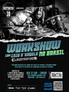 Com mais de 30 anos de estrada, Caio D’Angelo desembarca no Brasil para um Workshow exclusivo. O evento acontece nesta quinta-feira, dia 21 de agosto, na loja Destroyer Music Store, em São Paulo, às 19h30. Os ingressos estão à venda no site da Sympla. Quem adquirir os ingressos, ganha uma par de baquetas da marca Destroyer. Os ingressos são limitados.