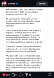 O jornalista José Norberto Flesch postou em suas redes sociais sobre o Cancelamento, citando o artista e a produtora de toda a Tour, como vocês podem ler, no print abaixo: