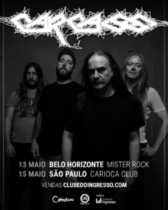 A banda inglesa Carcass, lenda do death metal mundial e uma das formações mais cultuadas do gênero, está de volta ao Brasil para duas apresentações neste mês de maio, dia 13/05 em Belo Horizonte/MG (no Mister Rock) e dia 15/05 em São Paulo/SP (no Carioca Club), com abertura das casas às 19h. A realização é da Overload.