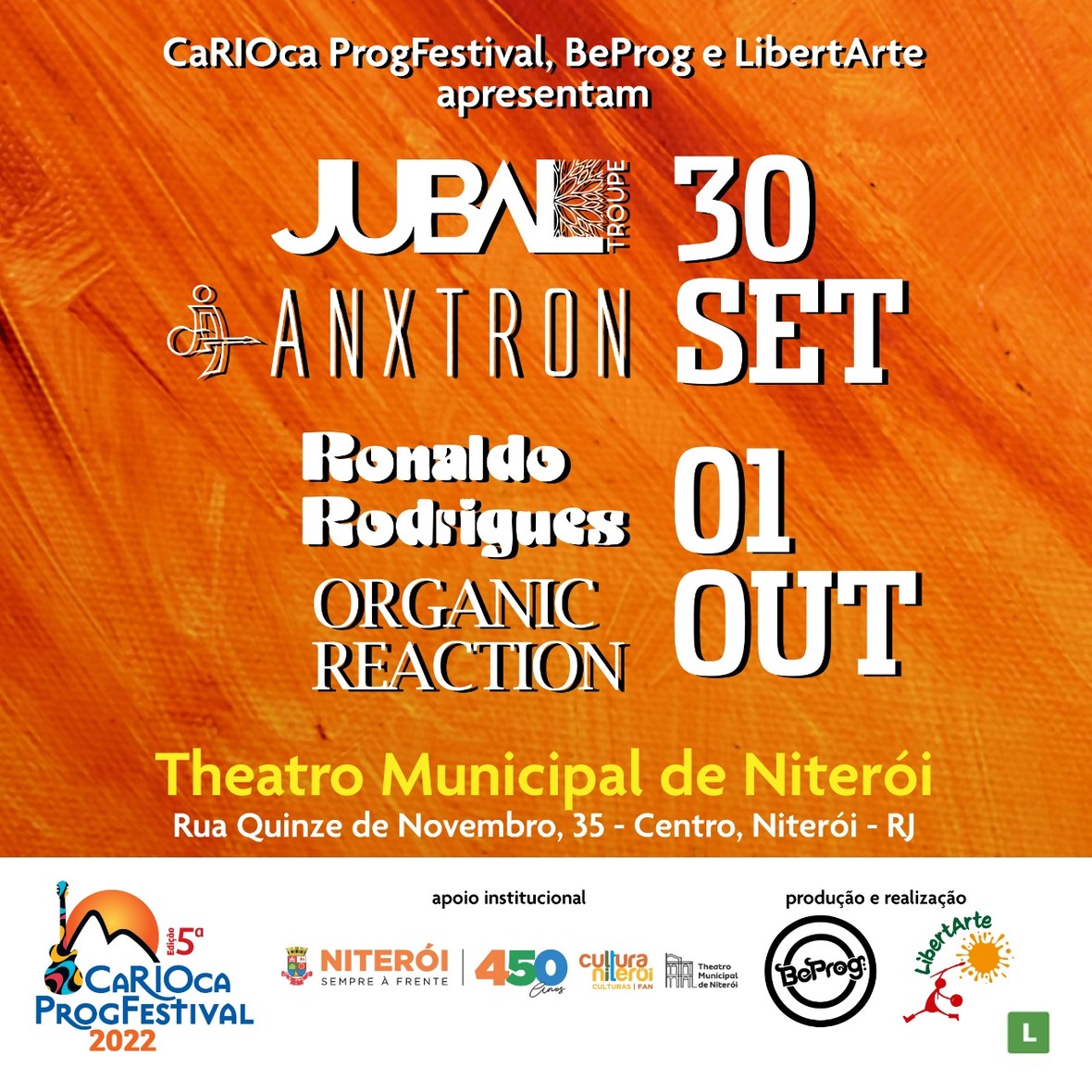 Consolidado como referência nacional na música progressiva, o CaRIOca ProgFestival chega à quinta edição em 2022 e anuncia quatro bandas para duas noites – 30 de setembro e 1º de outubro – no palco do Theatro Municipal João Caetano, em Niterói (Rio de Janeiro). As atrações deste ano são: Jubal Troupe, Anxtron, Ronaldo Rodrigues e Organic Reaction.