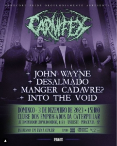 Já em Piracicaba, são quatro bandas que sobem ao palco antes do Carnifex: a local Into the Void, que é nome em ascensão da cena deathcore nacional, mais as já consagradas Manger Cadavre?, Desalmado e John Wayne.