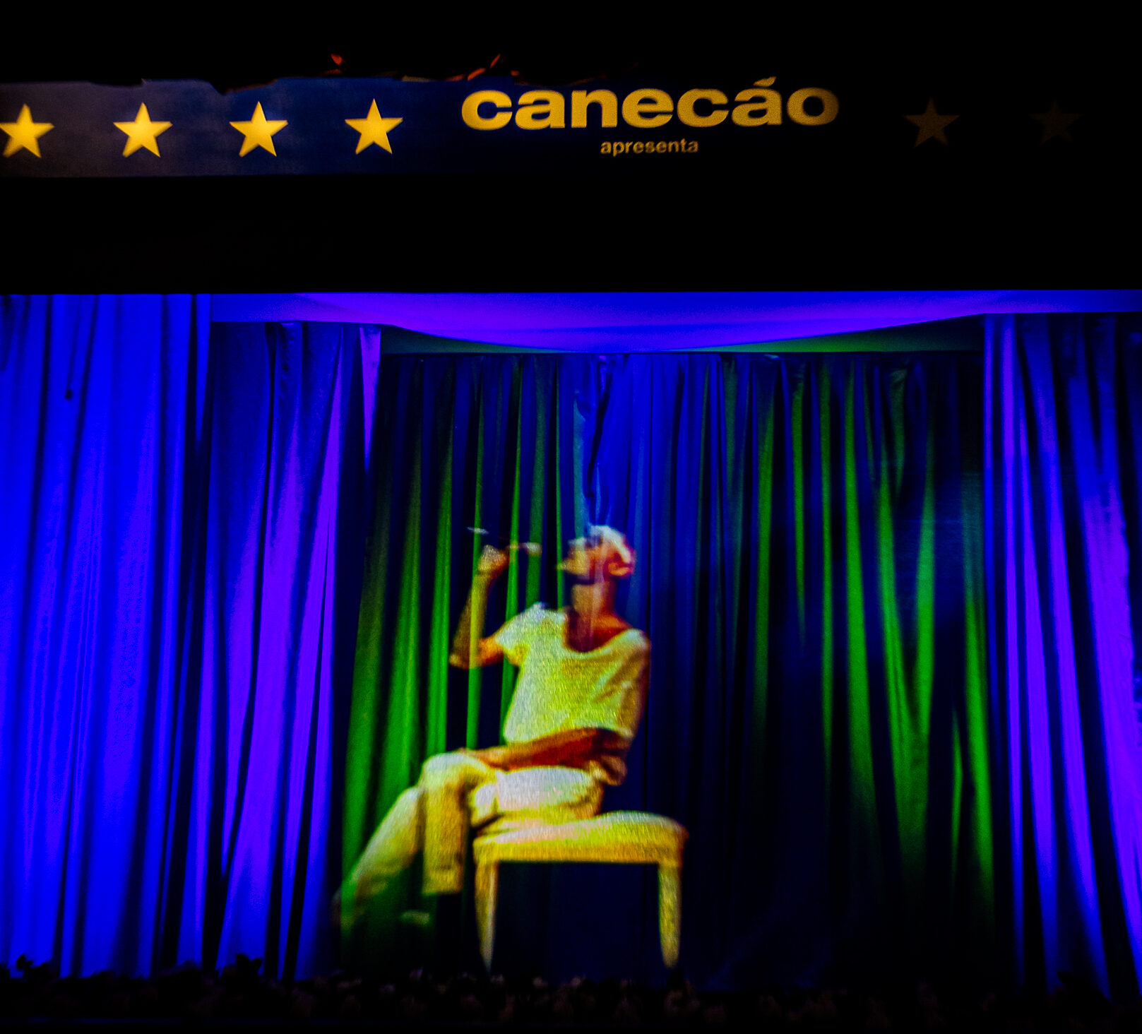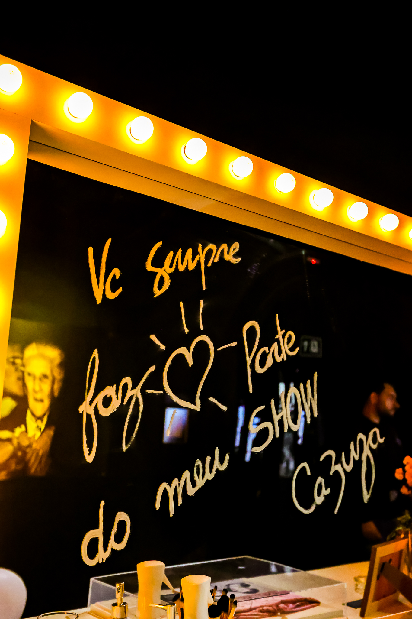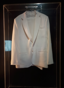 Então, ao sair desta sala, passamos por um corredor escuro, parece um backstage, ou a coxia de um teatro. Surgimos dentro de um camarim: aquele, o derradeiro. Seu blazer branco pendurado num cabide com seu nome gravado.