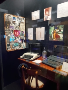 Eu, como jornalista, escritora e vocalista, tive arrepios ao ver: a escrivaninha original da casa dele, onde, sentado à máquina ele escreveu hinos e confissões “eu protegi seu nome por amor, em um codinome beija-flor”, poemas e cartas para amigos e familiares; o violão de suas composições; seu microfone – o parceiro de vários recados e levantes!