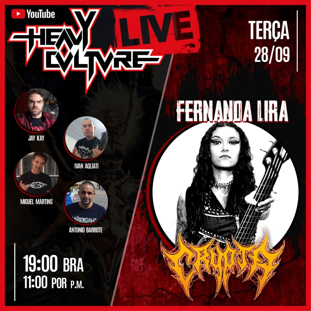 No dia 24/09 às 19h, sexta-feira, será a vez da banda Attomica marcar presença no HEAVY CULTURE, onde Andre e Pyda Rod dissecarão o debut “Attomica”, lançado em 1988. A última live de setembro será no dia 28/09 às 19h com Fernanda Lira da Crypta, que trabalha na divulgação de seu debut, “Echoes of the Soul”.