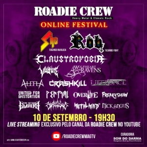 A revista Roadie Crew, em parceria com a produtora Som do Darma, apresentam na sexta-feira, dia 10 de Setembro, às 19h30, a décima-oitava edição do “Roadie Crew – Online Festival”. E a banda Claustrofobia, será o headliner desta edição. O evento online, realizado mensalmente, dá continuidade à sua missão de celebrar e promover o trabalho das bandas brasileiras e fortalecer a cena do heavy metal nacional, sempre com transmissão “Streaming-Live” exclusiva pelo canal oficial da Roadie Crew no Youtube – www.youtube.com/roadiecrewmagtv.
