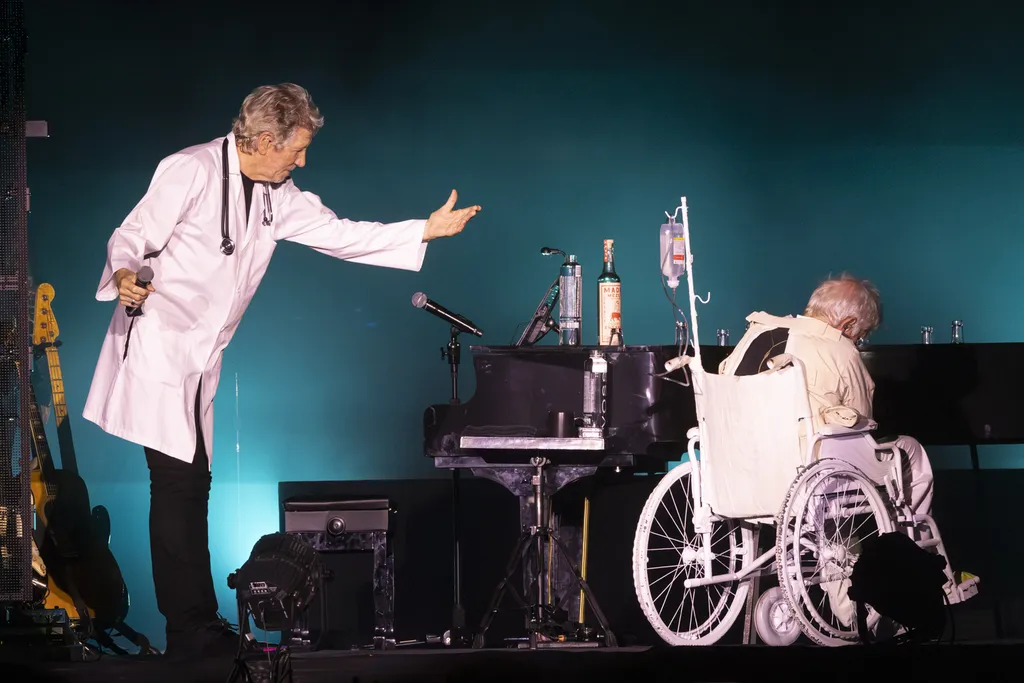 O primeiro set começou com uma versão estilizada de “Comfortably Numb“, com o imenso e impressionante telão ainda cobrindo a visão que o público teria de sua competente banda para dar lugar a uma performance teatral de Waters.