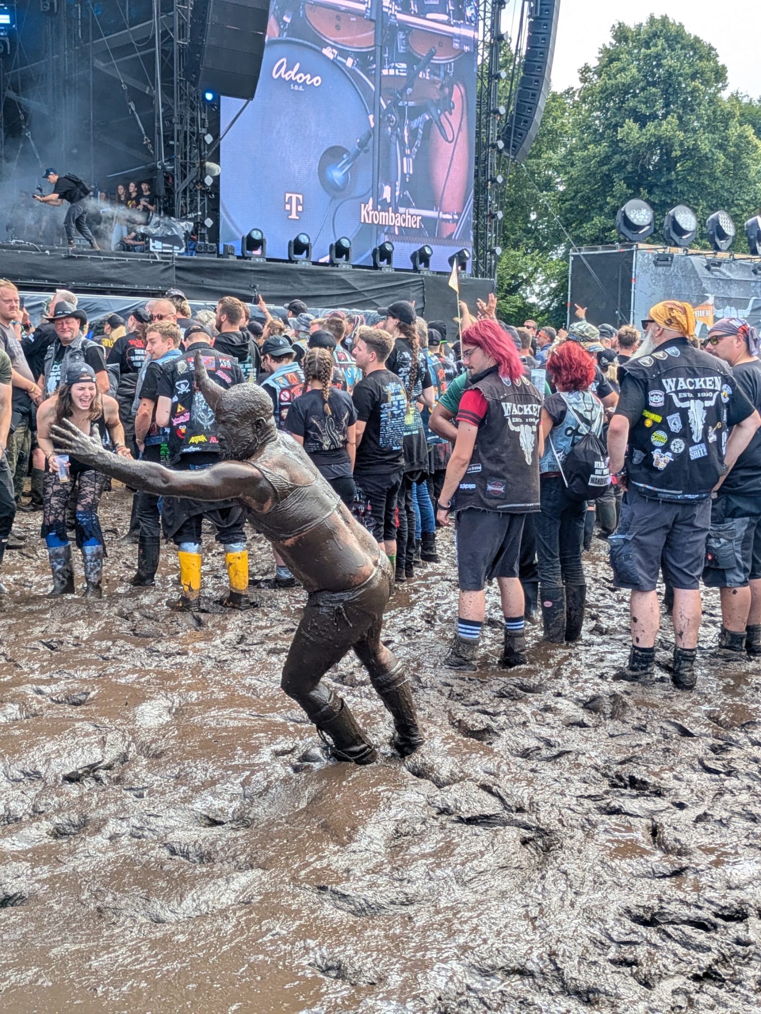 A jornada do Wacken 2025 começou já sob o peso das nuvens carregadas. Diferente de outros anos em que a chuva despeja sua fúria antes do festival e dá trégua durante os dias de show, desta vez a água caiu de forma persistente desde o início, impedindo qualquer chance do terreno secar. Ao adentrar os portões, o público foi recebido não apenas pelos riffs, mas também pela lama que se tornaria símbolo desta edição.