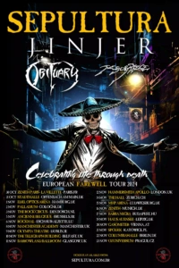 Na Europa, o Sepultura celebrará com vocês pela última vez. Como convidados especiais teremos os ucranianos do Jinjer – destaque do metal progressivo, se juntarão a eles em todas as 20 datas os também veteranos do death metal Obituary e a banda Jesus Piece, de Filadélfia.