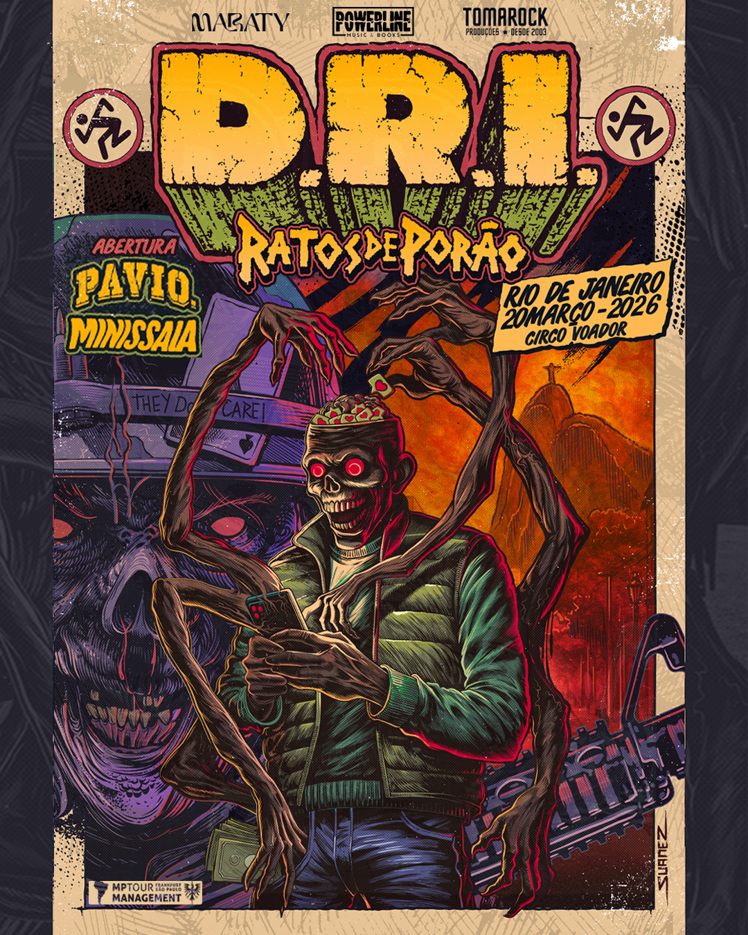 A turnê também passa no dia 17 de março de 2026 em Porto Alegre/RS (apenas o D.R.I.), no Ocidente, e segue dia 19/03 para Curitiba/PR, no Tork n’ Roll. No dia 20/03 é a vez do Rio de Janeiro/RJ, no Circo Voador, além de dia 21/03 em Belo Horizonte/MG, no Mister Rock, vejam abaixo os cartazes, com a arte do genial Cristiano Suarez.