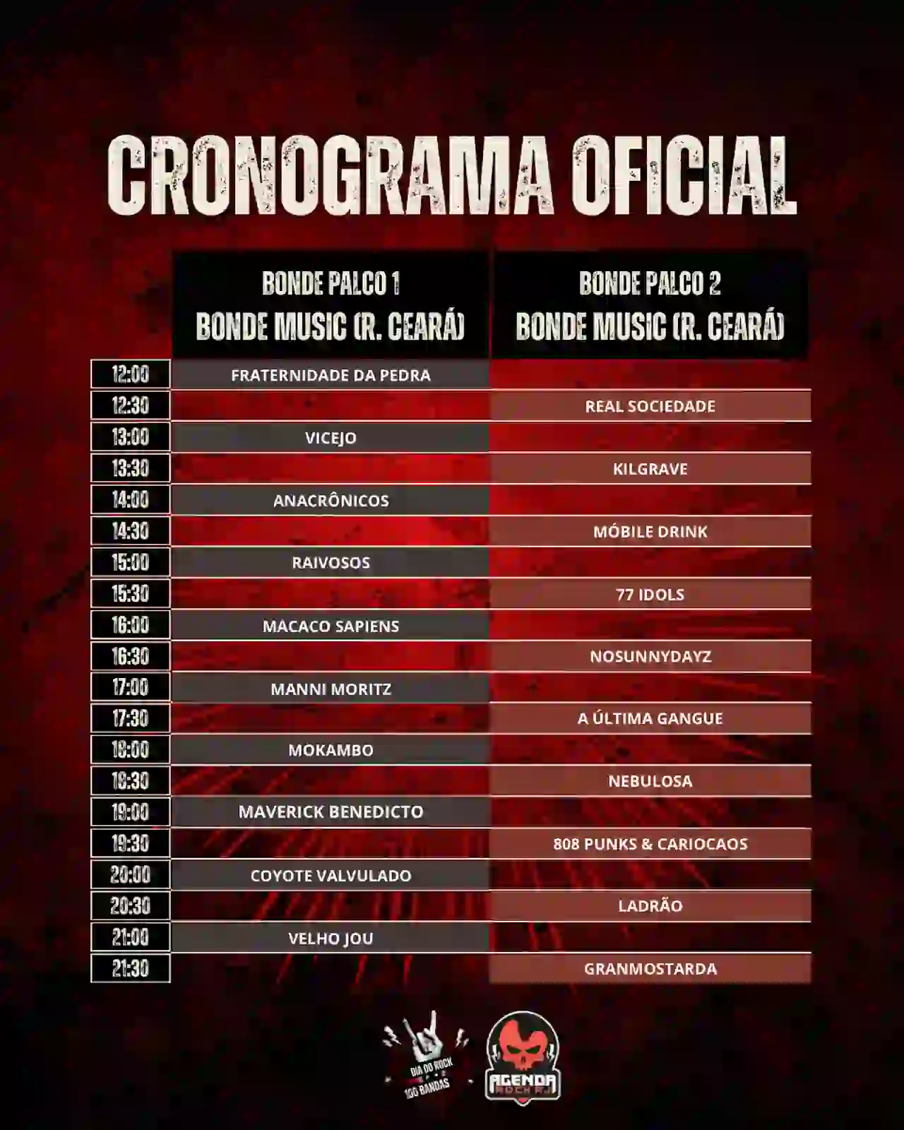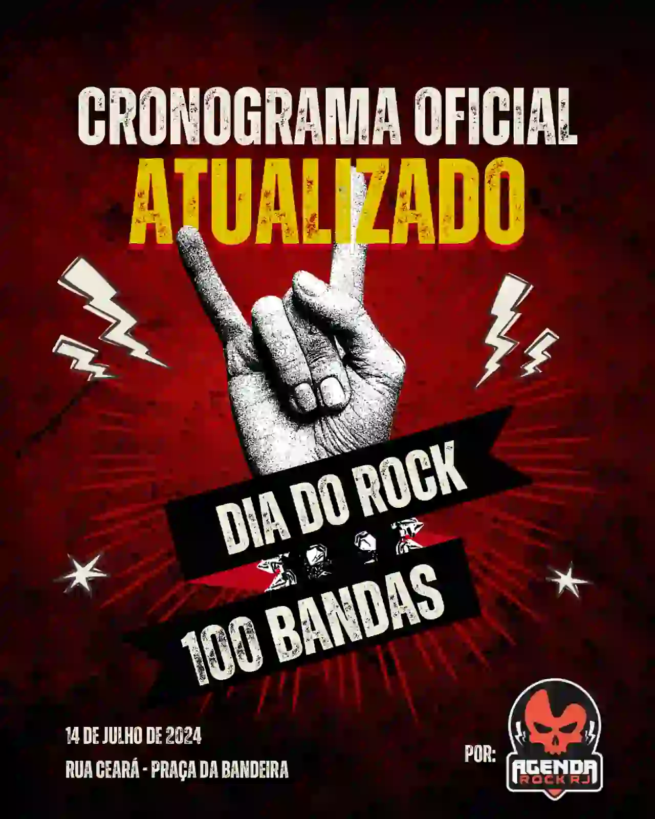 Dito tudo isso, eu deixo pra vocês aqui o Serviço do Evento inteiro, com imagens e os nomes das 100 bandas e aonde elas irão tocar e melhorando tudo, o grande Agenda Rock RJ ainda montou um grupo de WhatsApp (link abaixo) que irá informar, de 15 em 15 minutos as bandas que irão subir nos palcos. Bom né, então vamos TODOS para a Rua Ceará no dia 14 de Julho, pois o Rock no Rio não está NADA MORTO!!!