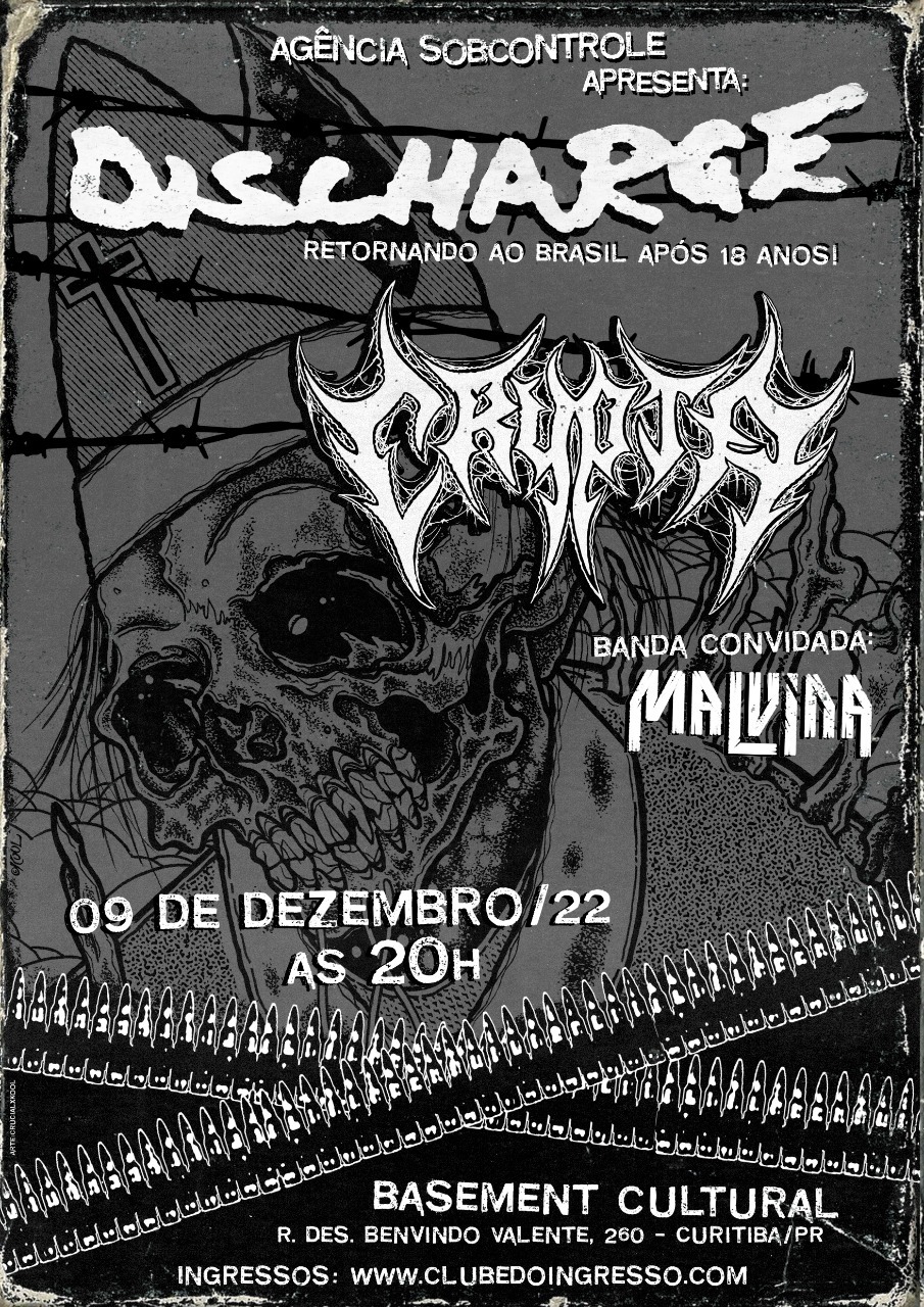 A icônica banda inglesa de punk Discharge anuncia mais um show no Brasil nesta nova turnê. No dia 9 de dezembro, a partir das 20h, será a vez de Curitiba, no Basement Cultural. O evento ainda terá a Crypta, um dos principais nomes do death/thrash metal mundial, além da abertura da Malvina. A produção é da Agência Sobcontrole.