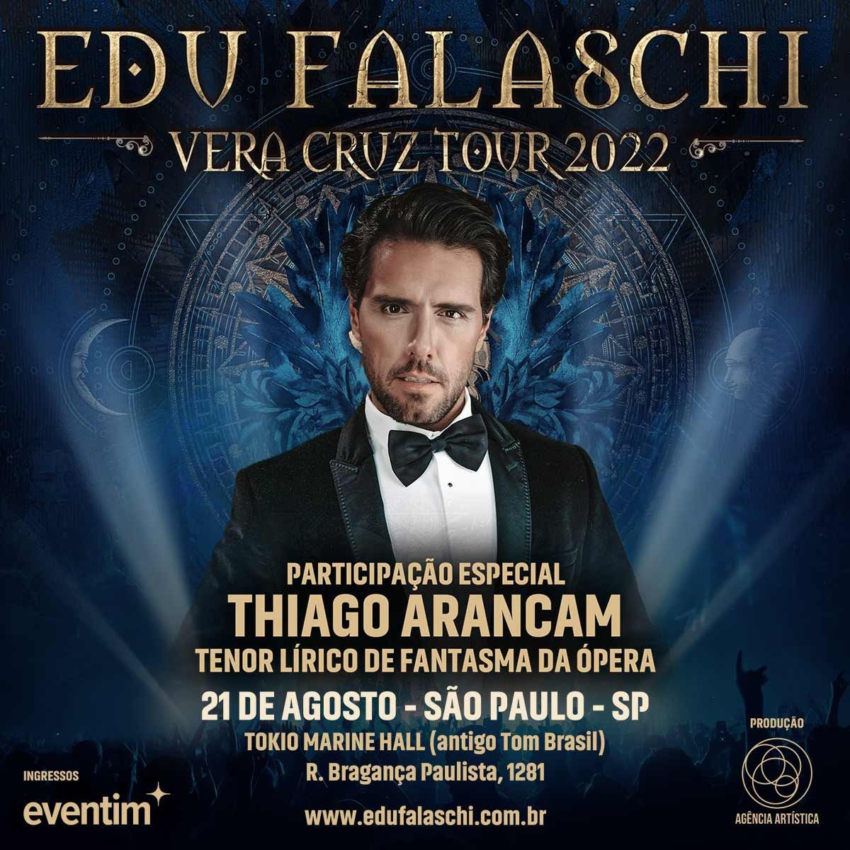 Thiago Arancam, um dos mais importantes tenores líricos do Mundo, intérprete de óperas internacionais como ‘Fantasma da Ópera’ e ‘Carmen de Bizet’ é um dos convidados do show de gravação de DVD do vocalista Edu Falaschi em São Paulo. Na Europa, gravou com Plácido Domingo, “Cyrano de Bergerac”; na São Francisco Opera (USA); “Madama Butterfly”, em Washington e “Carmen”; na Los Angeles Opera. O show acontece no Tokio Marine Hall (Antigo Tom Brasil), no dia 21 de agosto e faz parte da turnê que apresentará os álbuns “Vera Cruz” e “Rebirth” na íntegra com grande produção e palco cinematográfico.