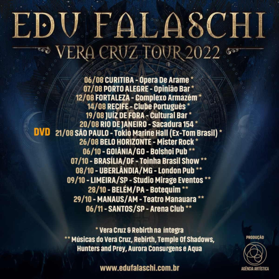 Após dois anos sem se apresentar ao vivo devido a pandemia do Covid-19, Edu Falaschi retorna aos palcos com uma turnê especial apresentando os álbuns “Vera Cruz” e “Rebirth” na íntegra. Com mais de quatro milhões de streamings nas plataformas digitais, Vera Cruz foi lançado em 2021 e é um sucesso de crítica e público. A banda de Edu Falaschi é formada por Aquiles Priester (bateria), Fábio Laguna (teclado), Roberto Barros (guitarra), Diogo Mafra (guitarra) e Raphael Dafras (baixo), além dos backing vocals de Raissa Ramos e Fábio Caldeira (Maestrick).