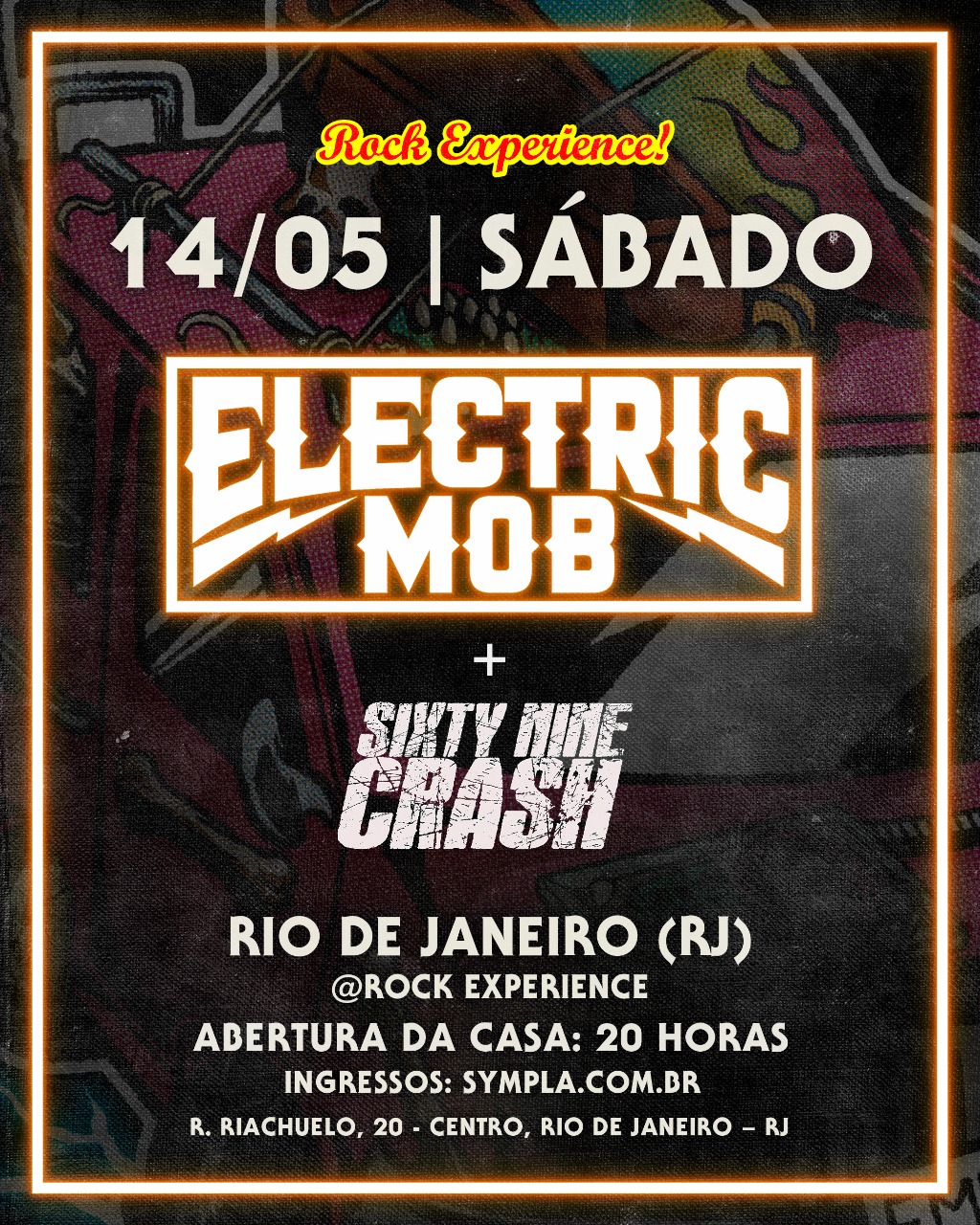 Ingressos: https://www.sympla.com.br/evento/electric-mob-no-rio-de-janeiro-rock-experience-sixty-nine-crash/1523618