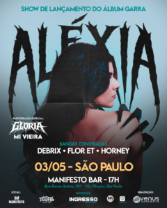 Aléxia fará o show de lançamento de Garra neste domingo (3 de maio), a partir das 17h, no Manifesto Bar, em São Paulo. O evento também terá participações das bandas Debrix, Flor Et e Horney e do Mi Vieira, vocalista do Glória. Ingressos à venda no Ingresso Master.