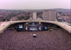 Vamos atravessar o Atlântico e chegar a tempo de ver o show mais comentado e lembrado até hoje do “Live Aid”. O Queen foi apresentado pelos comediantes Mel Smith e Griff Rhys Jones as 18h44, hora local, em Wembley, e podemos dizer categoricamente, que eles estavam jogando ‘em casa’, pois o que se viu naquele dia é que o Queen não teve a sua disposição um público, e sim uma verdadeira torcida. É impressionante assistir a reação de todos os presentes perante aos comandos do cantor Freddie Mercury, que levou toda a plateia no Wembley a bater palmas em uníssono durante a música “Radio Ga Ga” e a cantar junto, verso por verso, “We Will Rock You” e “We Are The Champions”, parecia que todo mundo estava lá só por causa do Queen. Não é por acaso que a apresentação da banda acabaria sendo eleito em uma enquete, como o “Melhor Show Ao Vivo” já realizado.