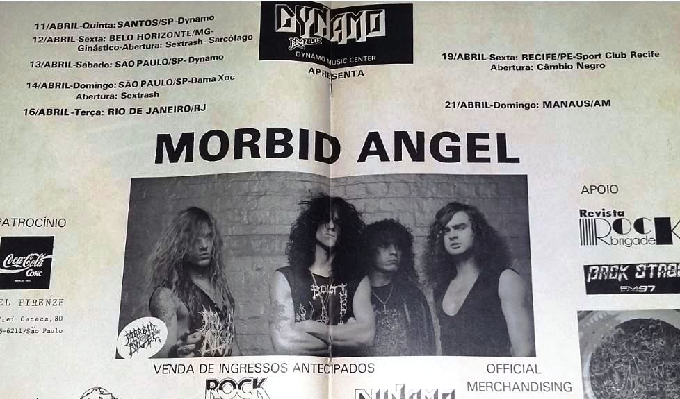 Com tudo devidamente esclarecido vamos entrar no ano de 1991, com a passagem dos mestres do death metal mundial, o Morbid Angel, aqui na terrinha. Com a produção da Dynamo a princípio foram confirmadas sete datas: 11 de abril em Santos-SP, 12 em Belo Horizonte-MG, 13 e 14 em Sampa, dia 16 no Rio, 19 em Recife-PE e no feriado de 21 de abril em Manaus-AM. Um verdadeiro giro pelo Brasil, que só foi possível graças a coragem da promotora e de co-produtores locais. Mas não pense que tudo foi festa, pois sobraram espinhos pelo caminho conforme vamos ver mais adiante.