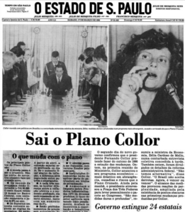 No dia seguinte a sua posse, em 16 de março de 1990, foi comunicado pelo presidente e sua equipe econômica a implantação do Plano Collor. Para quem não sabe, Plano Collor é o nome dado ao conjunto de reformas econômicas e medidas para estabilização da inflação. A teoria do plano econômico foi desenvolvida pelo economista Antônio Kandir e efetivamente implementada pela ministra da economia Zélia Cardoso de Mello e sua equipe e amplamente divulgados em jornais como O Estado de São Paulo.