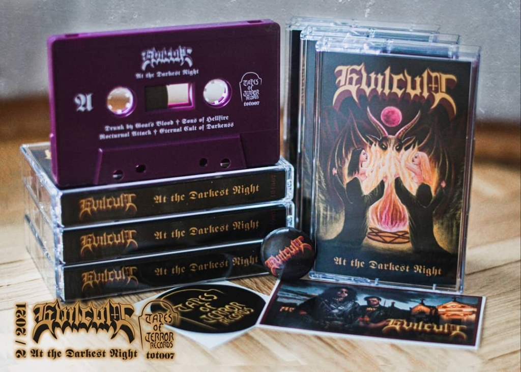 Já está disponível a segunda edição do debut “At the Darkest Night” em fita cassete através do selo Tapes of Terror Records da República Tcheca. São apenas 50 unidades em tapes roxas + botton + adesivos, para os mais fiéis apreciadores deste formato tão cultuado no underground. Entretanto, o EVILCULT não receberá cópias para revenda no Brasil, e a fita poderá ser adquirida somente através da loja virtual do selo: https://tapesofterror.webnode.cz.