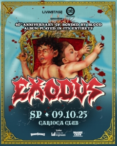 Uma tempestade de riffs devastadores está prestes a atingir a capital paulista! A Livingstage e CKConcerts, em parceria com Roadie Crew e Honorsounds, apresentam um evento que entrará para os anais do metal brasileiro: Exodus executará na íntegra o revolucionário disco Bonded by Blood, celebrando quatro décadas de uma obra que redefiniu os limites do thrash metal mundial.