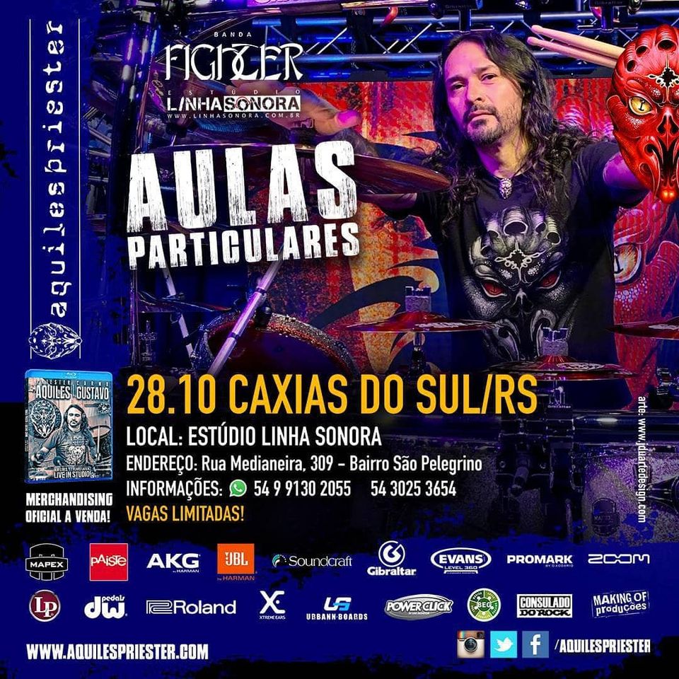 Cesar Branco (vocal), Alexsandro Gabrielli (guitarra e backing vocal) e Guilherme Adamatti (bateria) também divulgam a vinda do baterista Aquiles Priester (Hangar, WASP, Angra, Tony MacAlpine, Edu Falaschi) para um dia de aulas particulares no Estúdio Linha Sonora, no dia 28/10 em Caxias do Sul/RS. Verdadeiro ícone do Heavy Metal brasileiro, Priester estará ministrando aulas com agendamento pelo Whatsapp 54-3025-2055 e terá vagas limitadas.