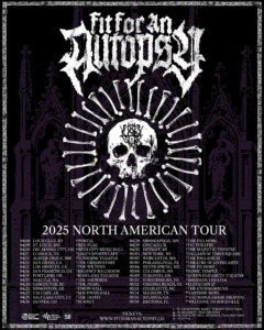 FIT FOR AN AUTOPSY dará início à sua turnê norte-americana de 2025 no dia 8 de abril! A jornada de 31 datas inclui shows com ARCH ENEMY em sua ‘turnê North American Blood Dynasty 2025’, acompanhados de BAEST e THROWN INTO EXILE, além de apresentações como atração principal ao lado de MUGSHOT, TRACHEOTOMY e GATES TO HELL.