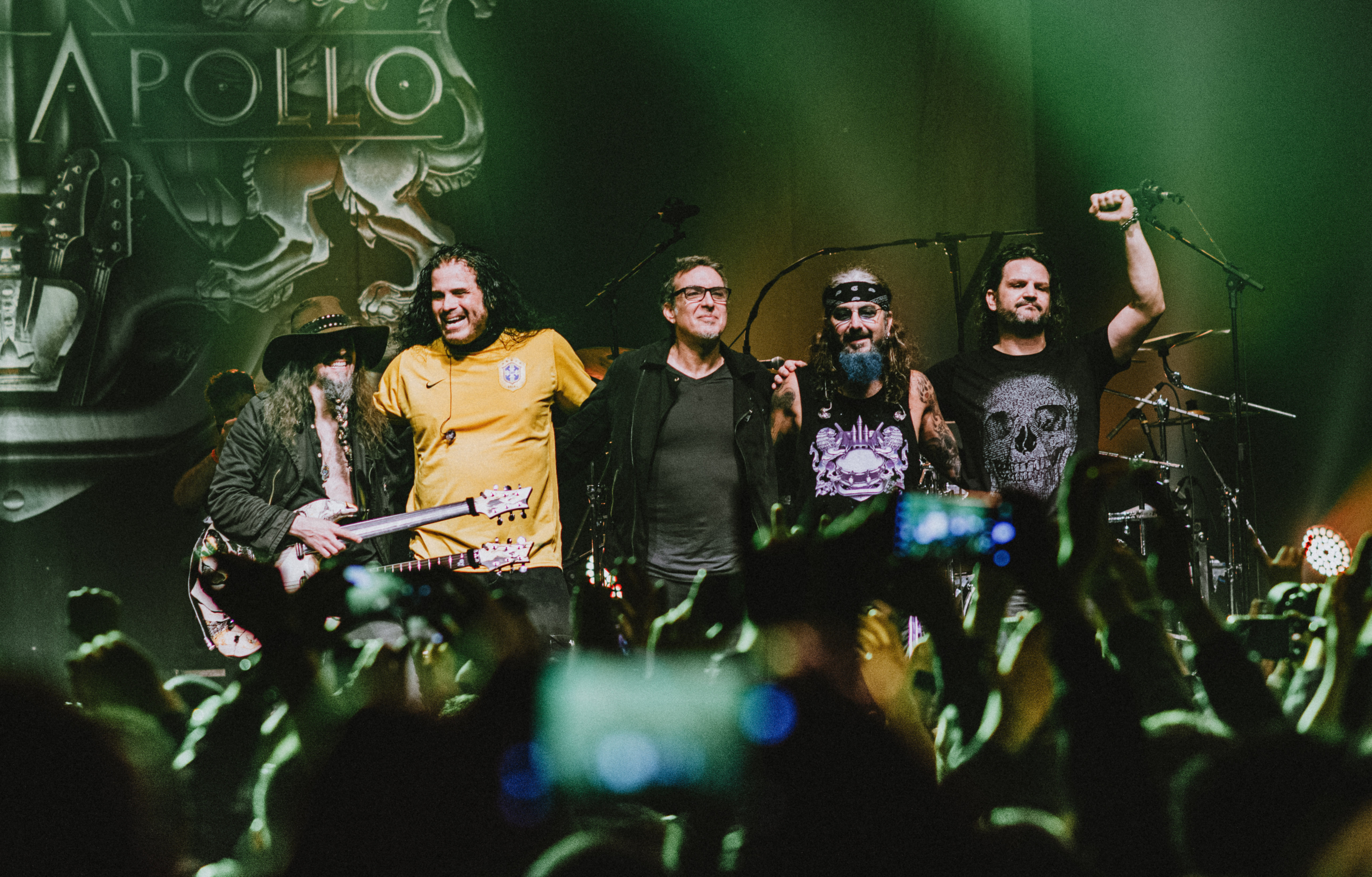 A ansiedade para ver os SONS OF APOLLO só aumentava na pista vip completamente lotada e nos demais setores. Às 10:15, conforme prometido, começa o show do quinteto de feras formado por dois ex-DREAM THEATER (Mike Portnoy e Derek Sherinian), Jeff Scott Soto (Malmsteen, Talisman), Ron “Bumblefoot” Thal (ex-Guns N’ Roses) e Felipe Andreoli (ANGRA, KIKO LOUREIRO TRIO), este último substituindo Billy Sheehan (Mr. Big). Felipe, agitando mais que o normal, mostrou que não precisou de muito tempo para pegar as músicas do dream team do Prog e já foi confirmado em outros shows fora do Brasil. “Desolate July”, originalmente gravada em homenagem ao falecido baixista David Z, do ADRENALINE MOB, morto em um acidente, emocionou o público, com direito a luzes de celulares tornando o chão do Tokio Marine Hall um céu estrelado. Ainda temos que destacar Bumblefoot tocando o hino nacional da guitarra na introdução de “New World Today“, Derek Sherinian arrasando tudo em “Figaro’s Whore”, chegando a fazer seu teclado soar como uma guitarra em um solo e a recepção do público para “Coming Home”. Ao fim, Jeff Scott Soto chamou a si e seus amigos como “Sons of Sao Paulo”, fazendo um trocadilho com o nome da própria banda. Que o bom filho à casa torne. E logo.