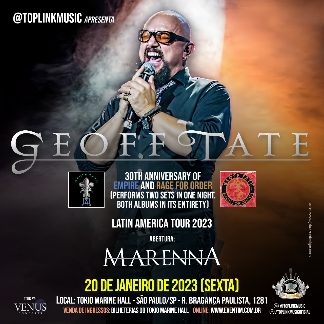 O vocalista original do Queensrÿche, Geoff Tate, se apresenta em São Paulo no dia 20 de janeiro de 2023 em um show especial tocando os álbuns “Empire”- Álbum que conta com os sucessos “Empire,” “Silent Lucidity,” “Best I Can,” “Jet City Woman,” “Another Rainy Night (without you)”, “Anybody Listening?” e “Rage for Order” na íntegra.