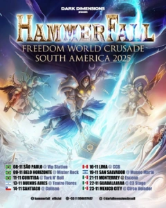 A produtora Dark Dimensions confirma o retorno do lendário HammerFall à América Latina com a turnê Freedom World Crusade South America 2025, trazendo toda a força épica e melódica que consagrou a banda sueca como um dos maiores nomes do Heavy/Power Metal mundial. No Brasil, o grupo fará três apresentações imperdíveis: