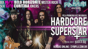 Desde a sua formação em 1997, o Hardcore Superstar tem causado impacto e cativado públicos ao redor do mundo com seu som energético mesclando hard, sleaze e glam metal. Liderado pelo vocalista Joakim “Jocke” Berg, e contando com Vic Zino (guitarra), Martin Sandvik (baixo) e Magnus “Adde” Andreasson (bateria), o grupo promove atualmente o álbum “Abrakadabra” (2022) e virá pela primeira vez ao Brasil. Com produção da Glamslam, o show em em Belo Horizonte (MG) será no dia 16 de novembro (quinta-feira) no Mister Rock, e dia 17 (sexta-feira) no Jokers, Curitiba (PR), ambos contando com a presença do Sioux 66 e bandas locais. Após os shows, haverá a realização da festa Glamslam, que conta com apoio da Jack Daniel’s e terá a participação de DJs de renome, Glamslam Girls e a Glamslam Band, tocando clássicos do hard rock.