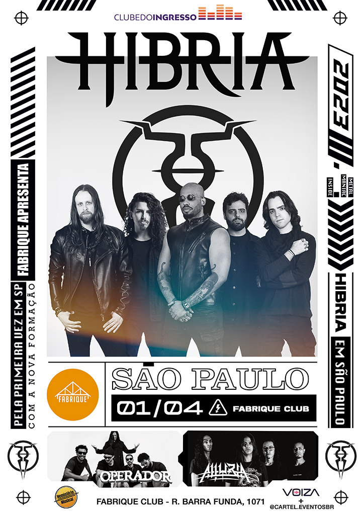Após fazer a estreia da nova formação, com Victor Emeka (vocal), Abel Camargo e Velles (guitarras), Thiago Baumgarten (baixo) e Otávio Quiroga (bateria), “Palaces Festival” (SC), o Hibria segue promovendo o álbum “Me7amorphosis“, sétimo da carreira, e se prepara para tocar no dia 1º de abril no Fabrique Club, em São Paulo (SP). O contará com a presença das bandas Operador e Alluria, e o show do Hibria será especial, pois terá participações especiais de Leandro Caçoilo (Viper, Caravellus) e Rick Monteiro (Alluria).